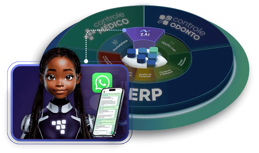 A inteligência artificial integrada às soluções de gestão ControleODONTO e ControleMÉDICO, atuando como uma secretária virtual que automatiza agendamentos, confirmações e comunicações com pacientes via WhatsApp.