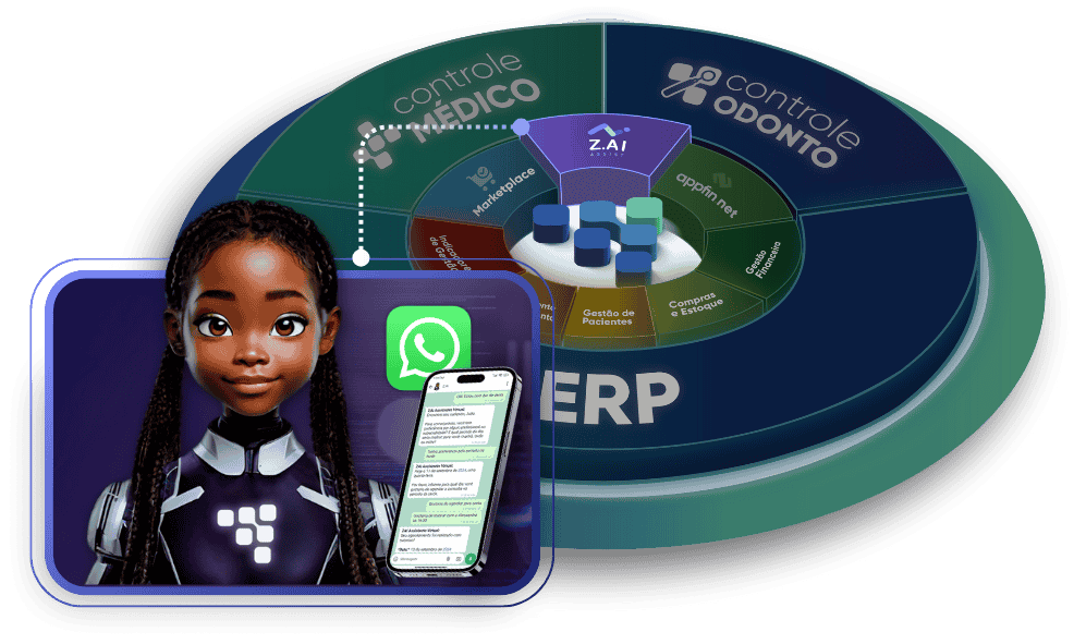 A inteligência artificial integrada às soluções de gestão ControleODONTO e ControleMÉDICO, atuando como uma secretária virtual que automatiza agendamentos, confirmações e comunicações com pacientes via WhatsApp.