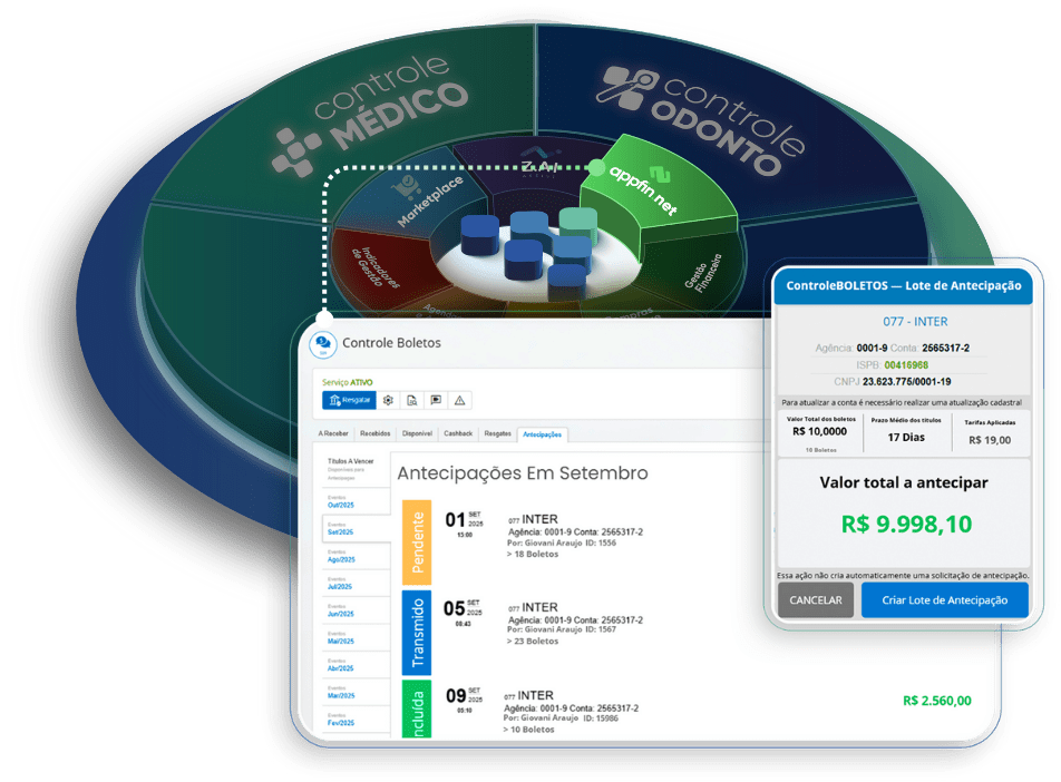 A Appfin.Net integra tecnologia financeira inteligente com a plataforma da clínica. É a nossa Fintech oferecendo soluções que proporcionam controle total sobre os recebimentos, mantendo a fluidez e segurança nas transações, tudo de forma intuitiva e prática: